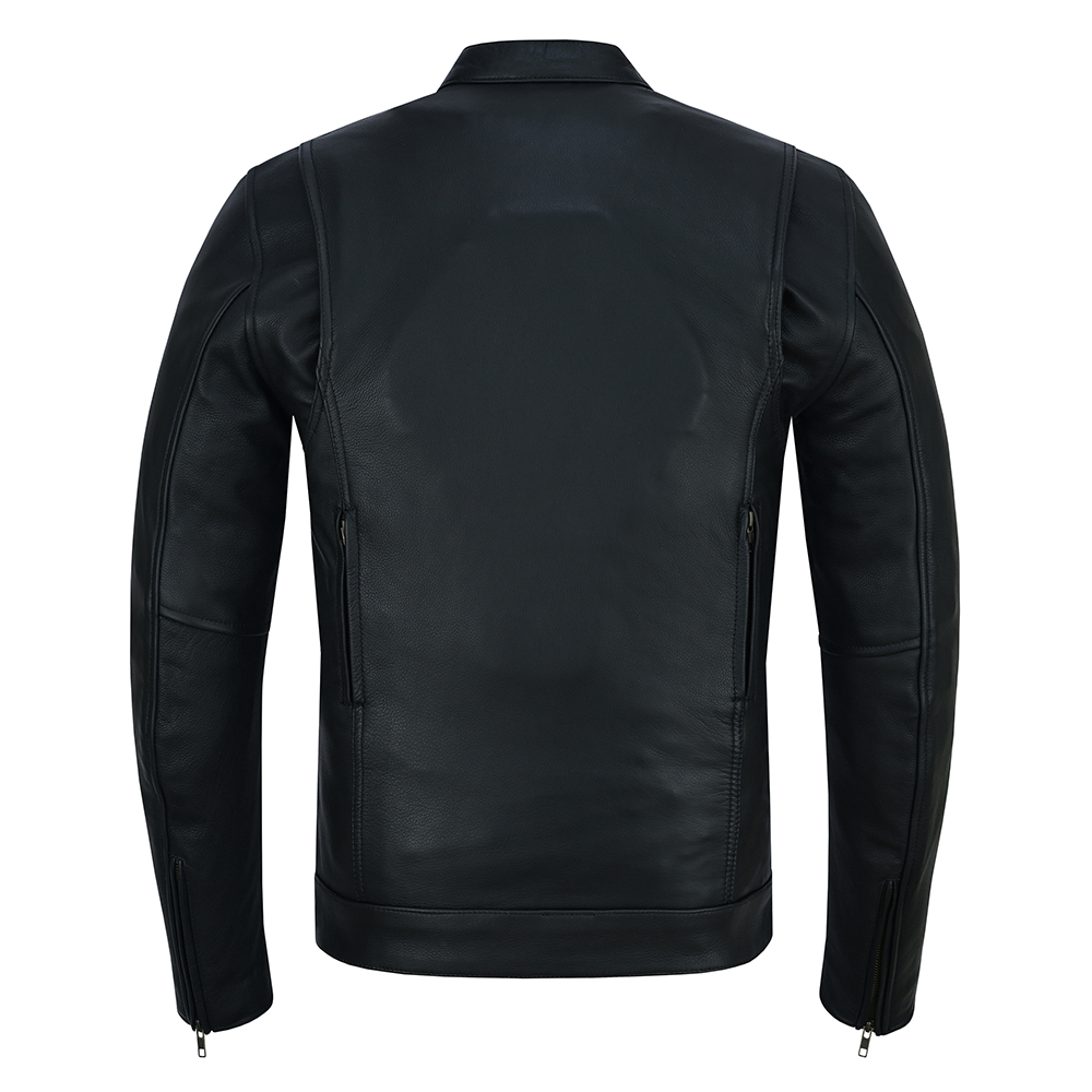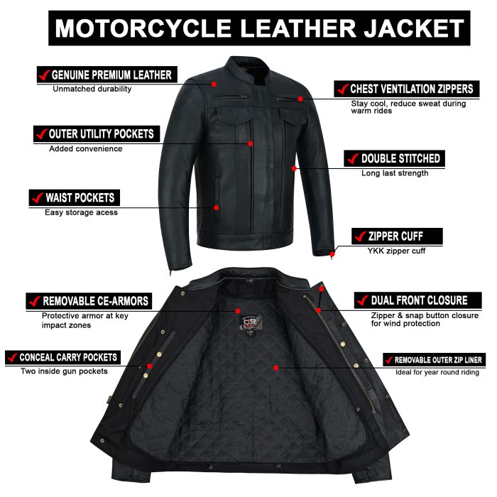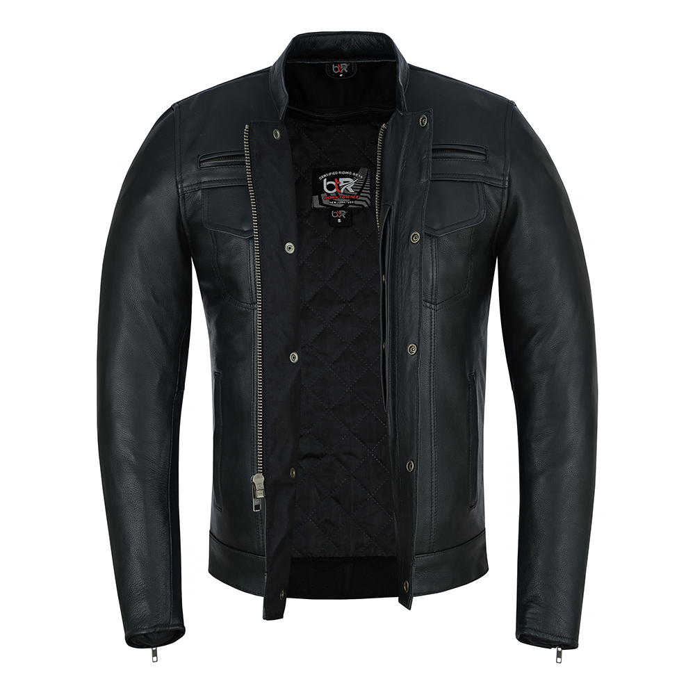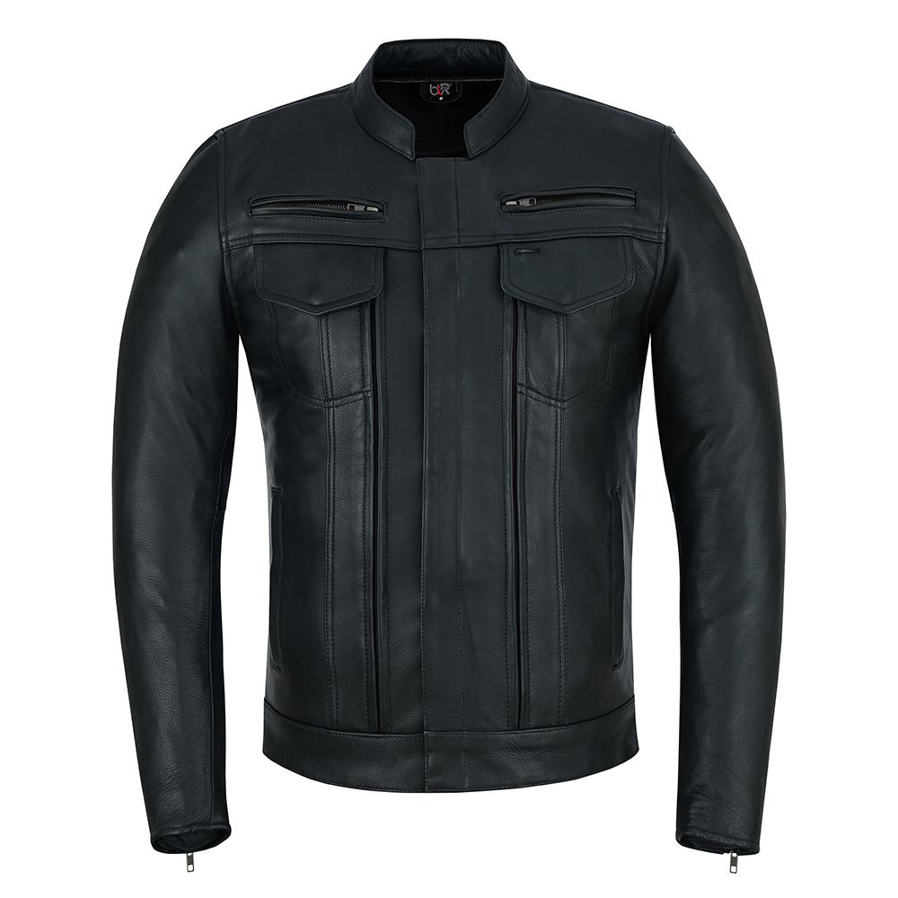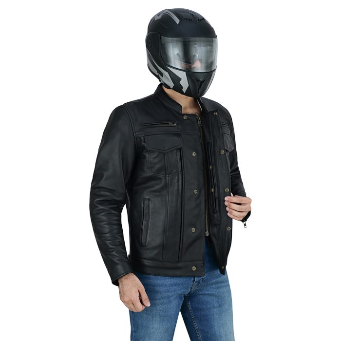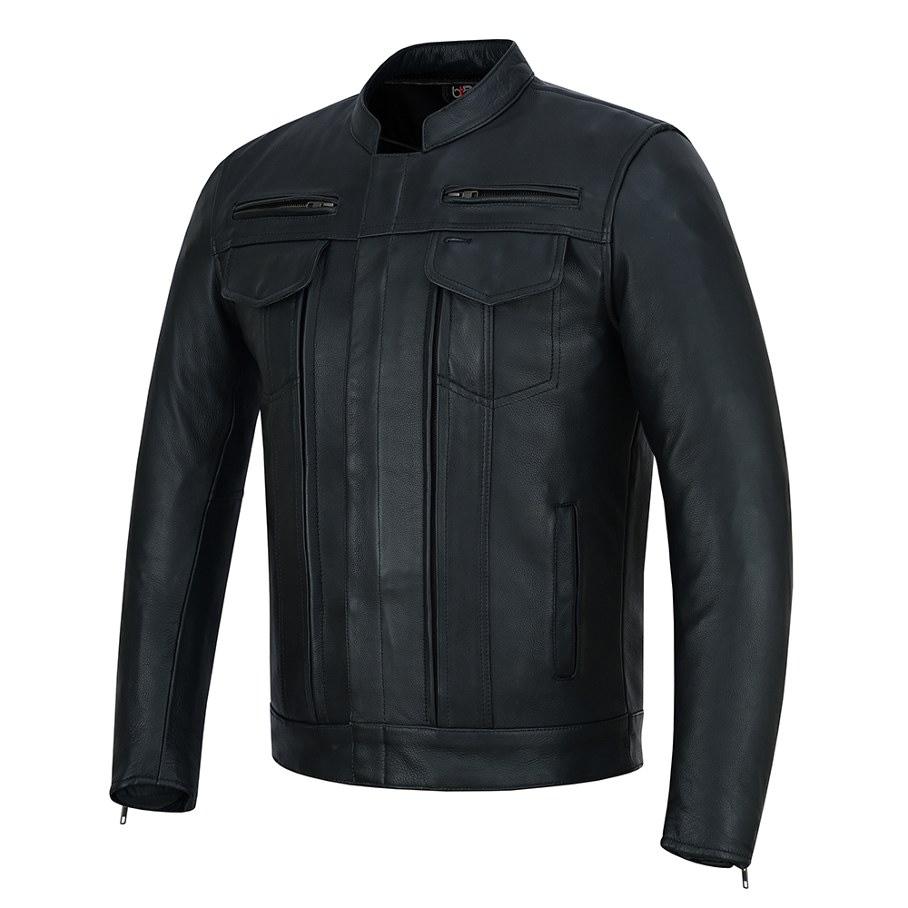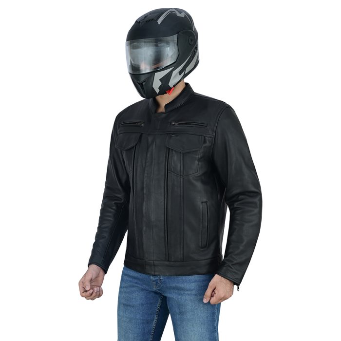 Classic Biker Style – Slim fit with mandarin collar and stylish stitching for a modern motorcycle look.