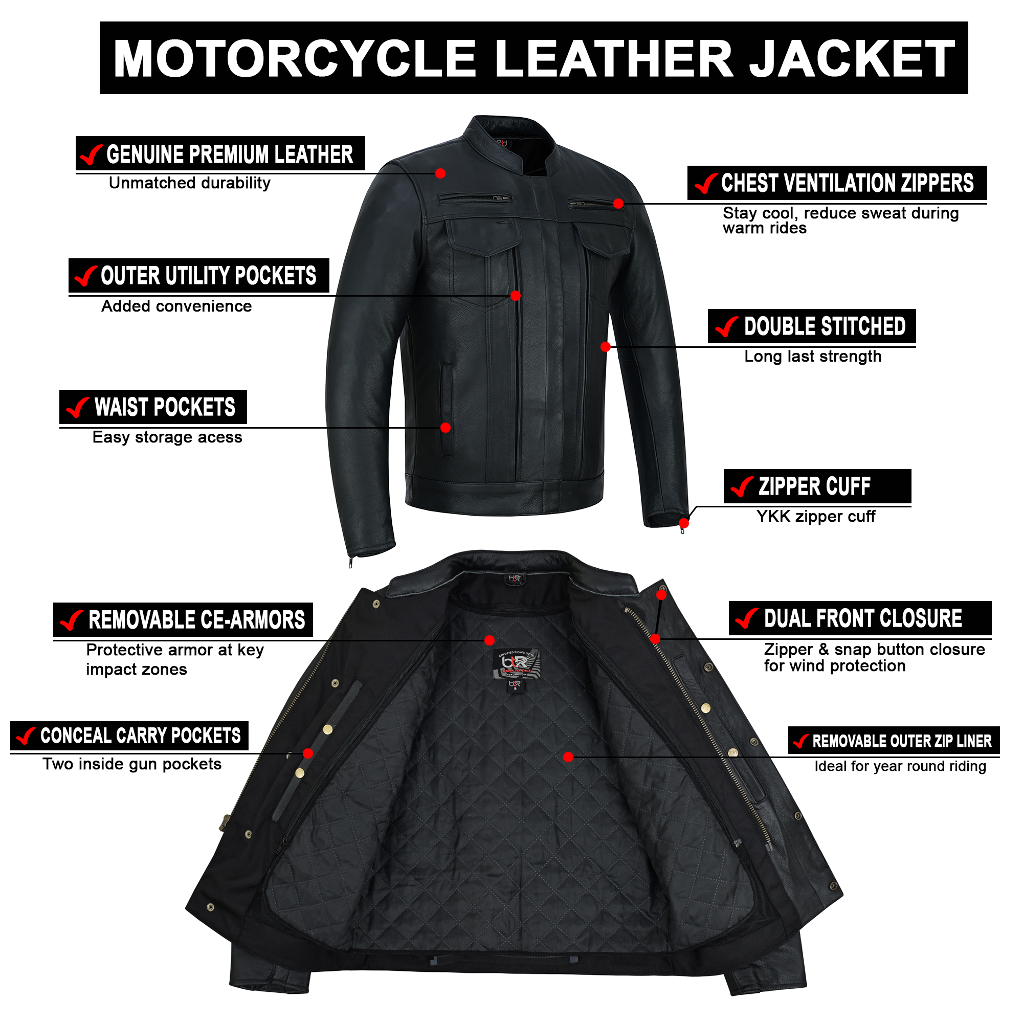 Overlord – Men’s CE-Approved Motorcycle Leather Jacket – Full Grain Cowhide, Removable Armor, Concealed Carry Pockets, Classic Biker Style with Thermal Liner Jacket